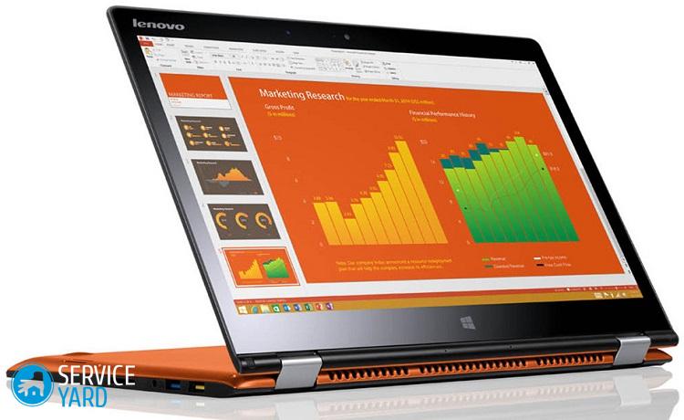 - La pantalla puede girar alrededor de su eje 180 grados, lo que le permite utilizar el dispositivo en seis modos diferentes. Uno de los modos de uso se llama Tienda: es perfecto para trabajar en espacios reducidos: transporte, avión, autobús u oficina pequeña.