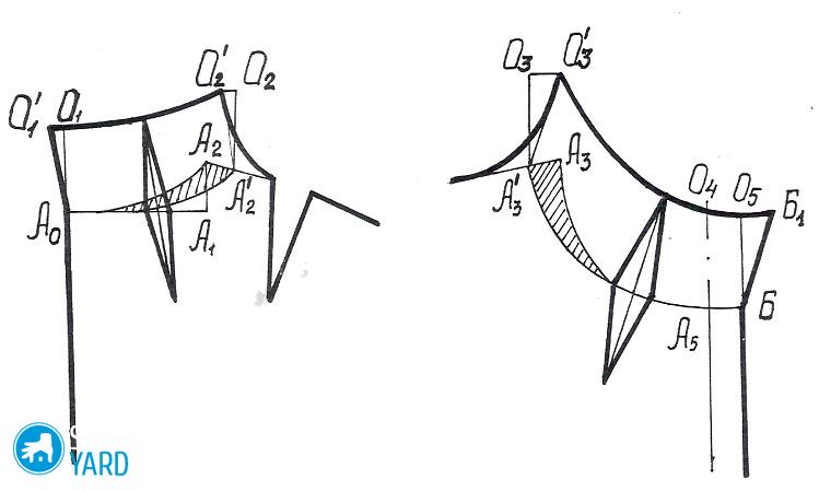 Aquí el punto principal es la marca Ш1. Desde el patrón posterior, este patrón difiere en dos puntos principales: la profundidad de la sisa (en el frente es más grande), la profundidad del corte. Diferiremos todas las mediciones desde el punto W1 a la derecha. En este caso, ya tiene las líneas principales: