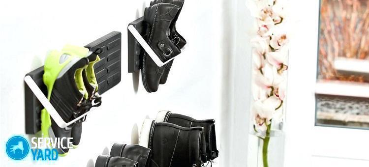 Para los zapatos de la izquierda (zapatillas, zapatos planos, zapatos de invierno), puede usar ganchos rellenos en la pared. Esta opción es especialmente buena para zapatos con cordones. Sujete los bots por los ganchos con cordones.