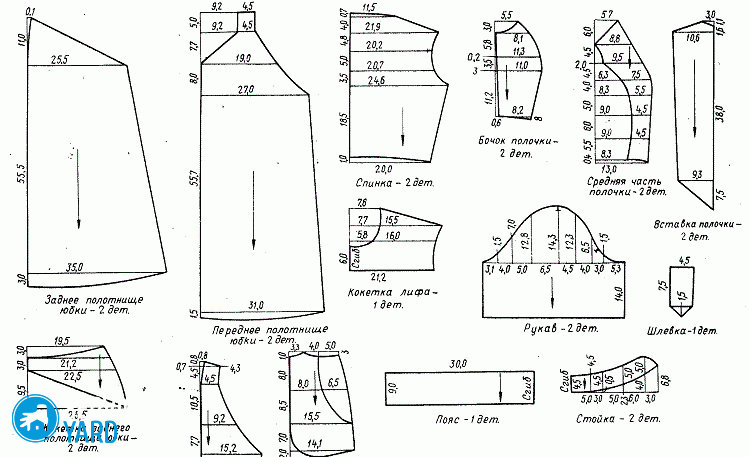 Ahora solo tiene que transferir los detalles recibidos a la tela, usando tiza o remanente. No olvide dejar márgenes para las costuras - 1 cm, y márgenes para el dobladillo - 4 cm. Si la tela está muy floja, entonces el margen puede aumentarse ligeramente.