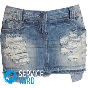 Muchas personas piensan en rehacer los jeans cuando aparecen rasguños en sus rodillas. Si esto sucedió con tus pantalones, no te apresures a tirarlos. Tales jeans pueden hacer una impresionante falda de corta longitud. Además, es adecuado tanto para una niña adulta como para una niña pequeña. En el segundo caso, solo necesita coser volantes alrededor del borde.