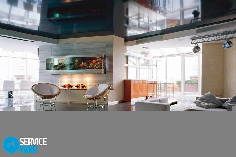 Un tanque de pantalla estrecho suspendido del techo puede servir como fuente de luz adicional y bastante grande. Dichos contenedores se ven especialmente impresionantes en habitaciones espaciosas de dos niveles, que realizan la función de una partición entre los niveles superior e inferior del espacio.