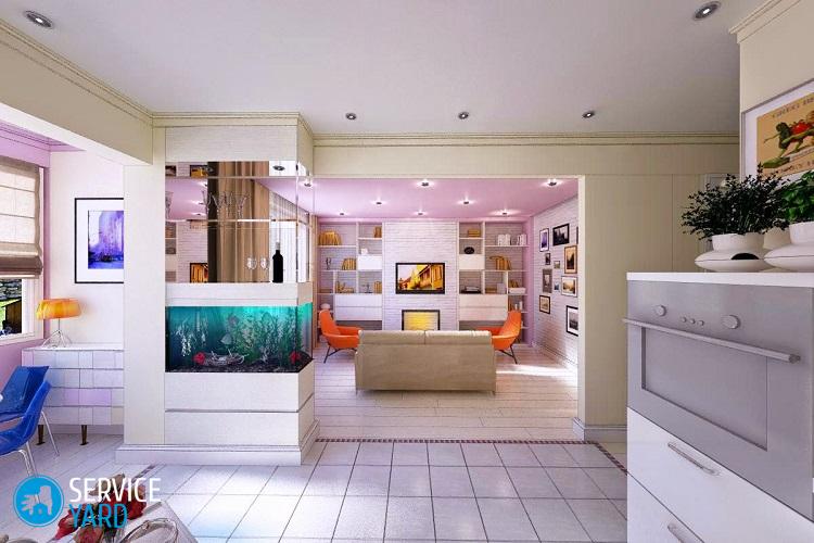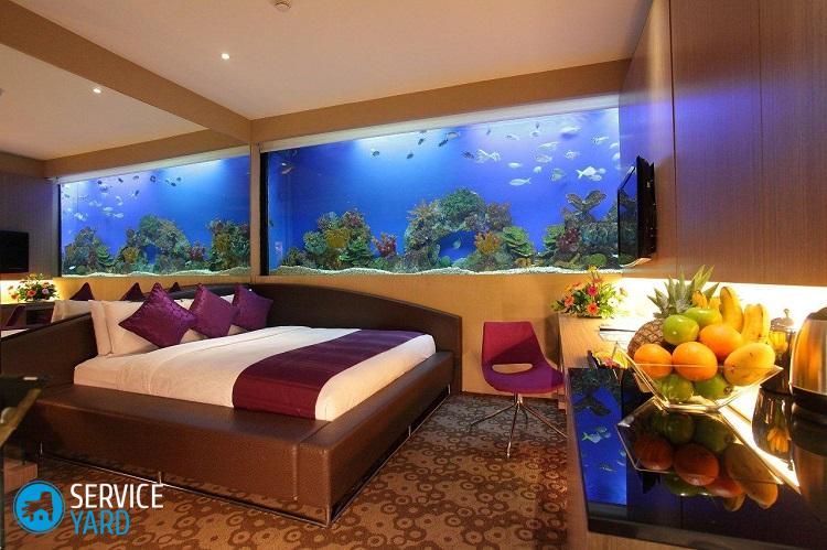 Incluso en un apartamento pequeño puede colocar un acuario. Para ahorrar espacio, se puede instalar una decoración exótica con peces entre las paredes de las habitaciones. Esta idea le dará ligereza y elegancia a sus habitaciones.