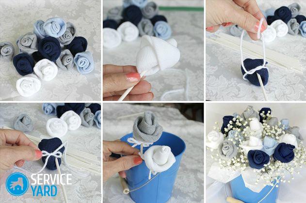 Para hacer un ramo de flores para un niño o una niña, se requerirán casi los mismos materiales y herramientas. Sin embargo, vale la pena considerar que los calcetines deberán elegir un tono más delicado: rosa, rojo, amarillo.
