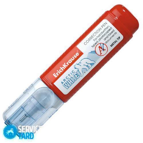 - Lápiz corrector. La forma se asemeja a una pluma convencional con una punta de metal a través de la cual fluye el líquido corrector. Con la ayuda de dicha herramienta, es posible corregir con precisión incluso los detalles de texto más pequeños.