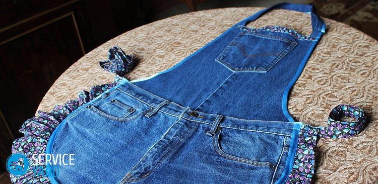 - Delantal Es fácil de hacer desde la parte posterior de los jeans viejos, es conveniente usarlo en la cocina o en el taller, gracias a los bolsillos.