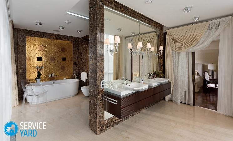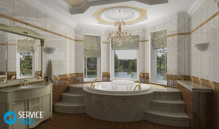 Importante! Para dividir la habitación en zonas funcionales o para enfatizar, use siempre columnas para ayudar. Este es un elemento estándar de decoración, que se utiliza en el diseño clásico del baño. Las molduras ubicadas en ellos agregarán más refinamiento y brillo.