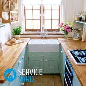 - El conjunto en una cocina pequeña debe ser compacto. Es mejor usar armarios colgantes con puertas que se abran. Dentro del gabinete puede montar todo tipo de ganchos para utensilios de cocina (tazas, sartenes).