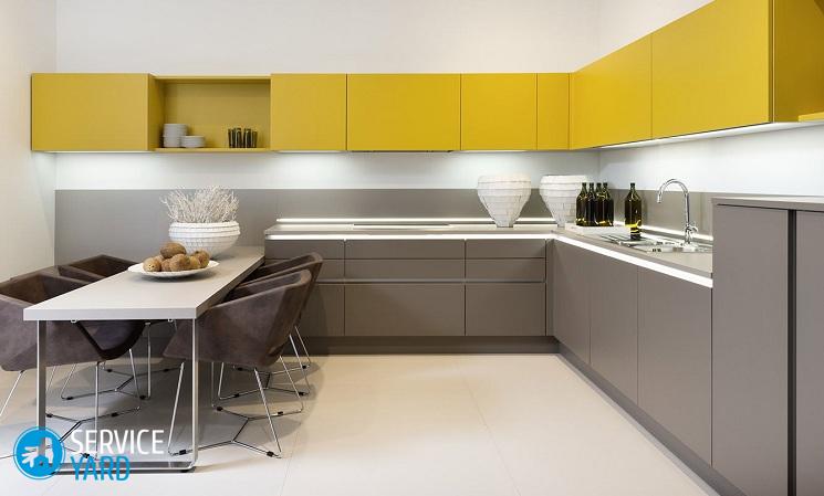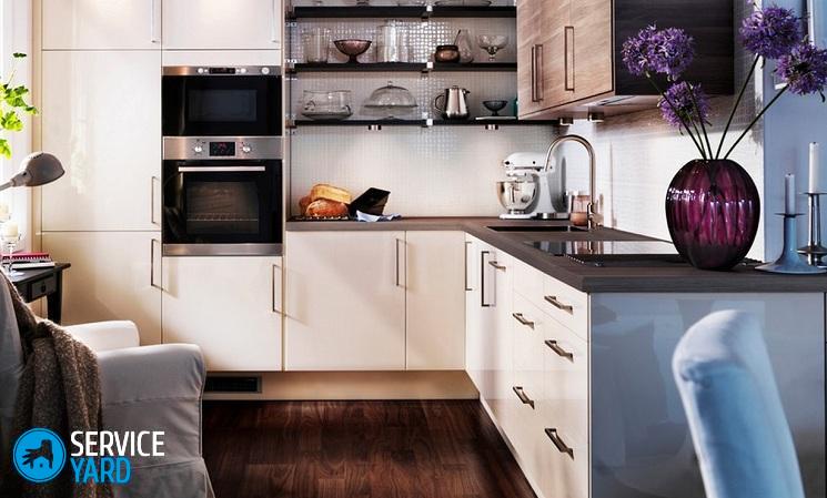 Una de las desventajas de esta opción de diseño de la cocina es su alto costo. Tal diseño necesita paredes perfectamente uniformes, por lo que deberá realizar trabajos de reparación adicionales. Además, el auricular "volará en un centavo", ya que debe hacerse a pedido.