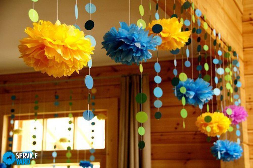 Una guirnalda de flores hecha de papel el 8 de marzo, hecha con el mismo principio, se verá bien, por supuesto, pero las figuras voluminosas colgadas de un hilo serán mejores. Examinaremos con más detalle cómo dar vida a tal idea: