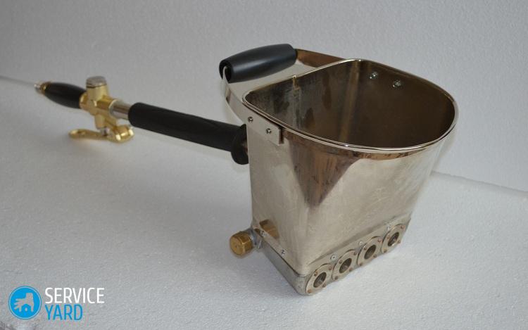 Las modificaciones son muy similares, pero hay diferencias en el diseño de la parte inferior. Si va a enlucir las paredes, la boquilla debe estar exactamente opuesta a la abertura del conducto, colocada en ángulo recto con la superficie del mortero. Para los cubos utilizados para enlucir los techos, la salida se coloca en un ángulo adecuado. Además, tales modelos siempre tienen una tapa para la abertura, y se coloca en el lado donde está el trabajador, para que la mezcla no se derrame.
