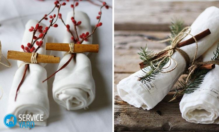 No es difícil enrollar una servilleta con un tubo; para esto, un cuadrado que esté lo suficientemente doblado cuatro veces simplemente se envuelve alrededor de dos o tres dedos. Y puede vendar cada tubo con un cordón de color, por ejemplo, hilo sintético o cintas, que generalmente se usan para atar regalos.