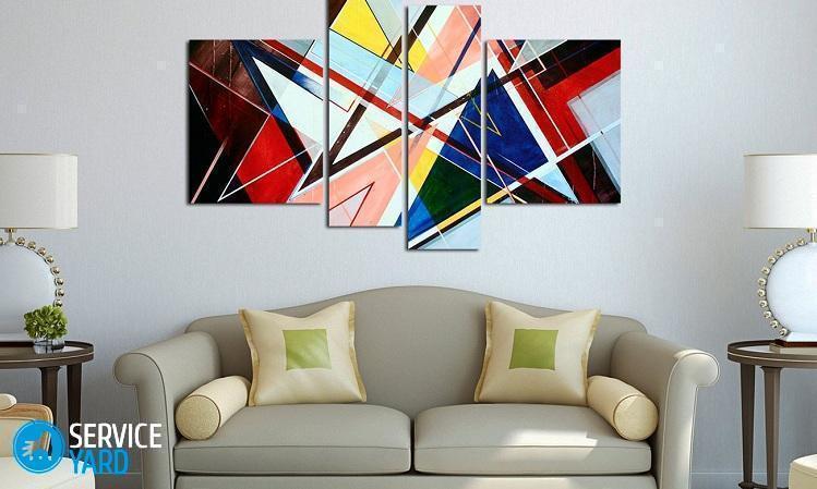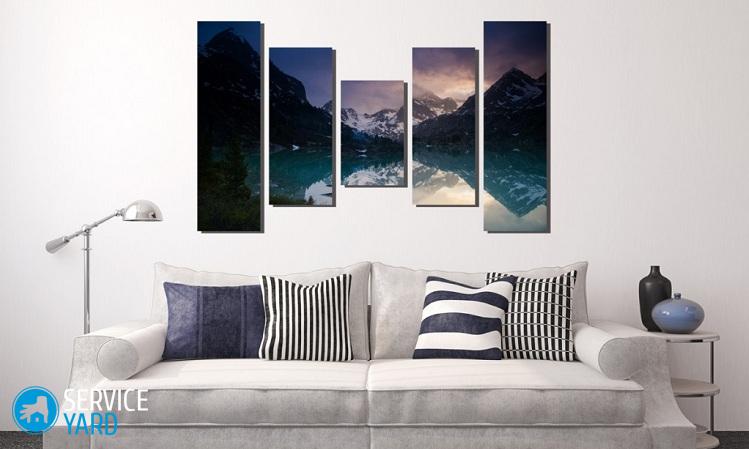 Este método le permite colgar una imagen para no dañar el acabado decorativo de la superficie de la pared, mientras cambia su ubicación con la frecuencia que desee. Este diseño también se llama colgante de galería, ya que no solo se pueden unir pinturas, sino también otros elementos decorativos.
