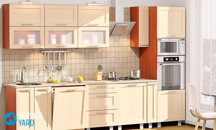- La instalación se completa con el ajuste de los gabinetes de cocina con bisagras. Los elementos de los muebles están alineados con las paredes y los armarios adyacentes, y después del ajuste se unen. Las acciones tomadas son idénticas al método tradicional.