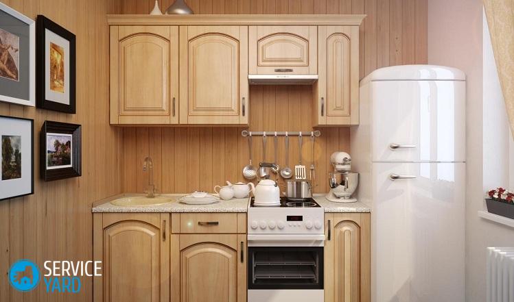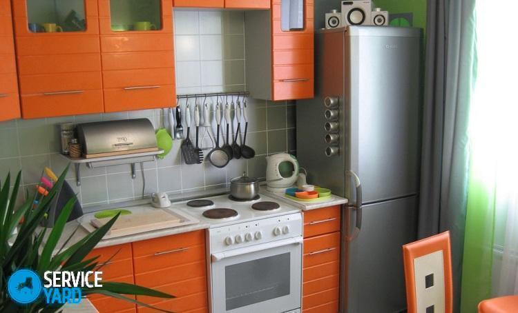 En una cocina pequeña, todos los objetos altos se colocan mejor en los bordes para que no haya espacio en el espacio de la encimera. Cuando piense en arreglar muebles en una cocina pequeña, preste atención a qué lado se abre la puerta del refrigerador. En este caso, la mejor opción es si se abre a la pared más cercana y podría abrir 90 grados para que pueda colocar o retirar libremente los productos necesarios del refrigerador.