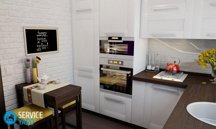 En cocinas estrechas y muy pequeñas, es mejor colocar una mesa debajo de la pared, puede elegir cualquier forma, o mejor, un modelo plegable.