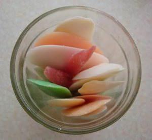 Las piezas restantes deben ser aplastadas, poner en platos y verter agua caliente. Los platos deben estar bien cerrados para que el producto se derrita. Revuelva cada veinte minutos. Cuando el producto se haya derretido por completo, será posible descomponerlo en moldes y dejarlo en un lugar fresco hasta que se vuelva sólido nuevamente. Se recomienda engrasar las formas con aceite vegetal, para que pueda obtener el producto fácilmente más tarde.