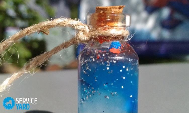 El espacio pequeño en un frasco puede no estar en un estante de la habitación. Puede hacer una gran pieza de joyería que se puede usar con un suéter liso, por ejemplo. Para hacer esto, necesita una botella muy pequeña de una forma hermosa y una cadena. Es mejor tomar una botella con un corcho de goma o de madera; es más fácil hacer agujeros en estos materiales: