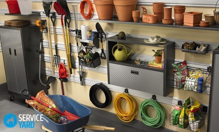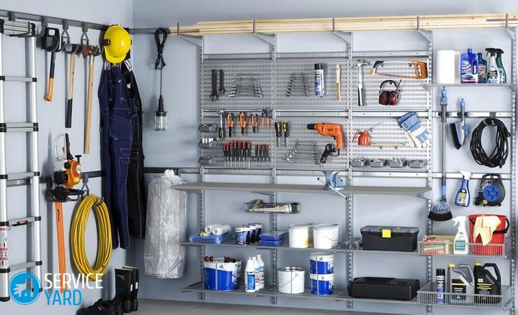 El estante de garaje de bricolaje para herramientas en forma de escudo es una opción bastante popular para organizar el espacio útil. La parte principal del bastidor es un escudo fijado a la pared con anclajes. Se sujetan soportes, ganchos para herramientas.