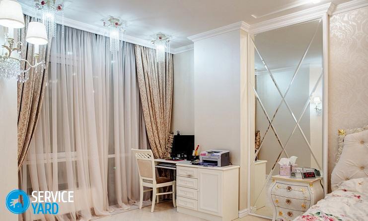 En principio, esta habitación no necesita cortinas, pero si desea cubrir originalmente la puerta del balcón, esta opción es ideal para usted. El diseño de la cortina será bastante simple, pero irá bien con la puerta.