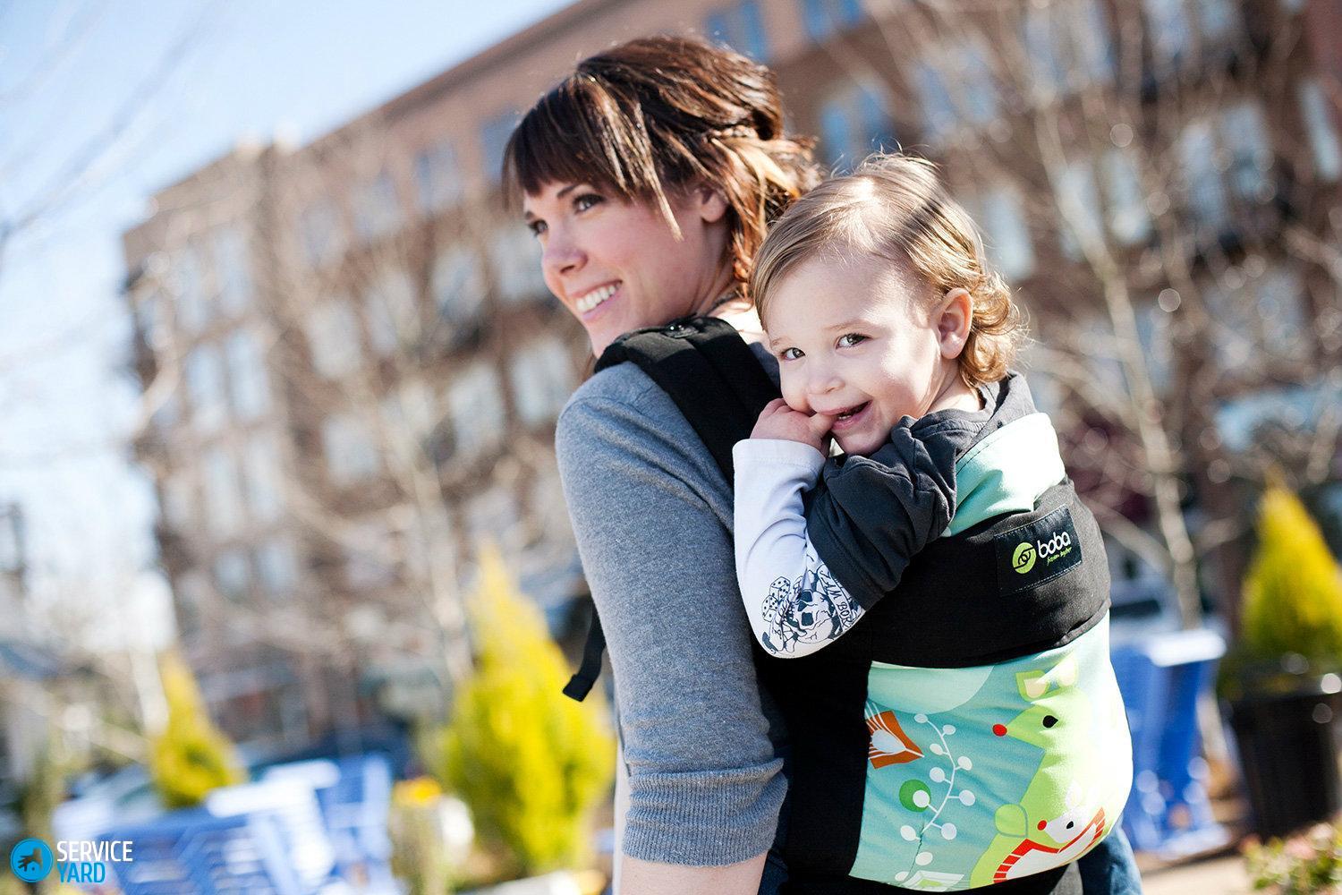 - Mamá o papá están detrás. El principio de ponerse una honda es el mismo que una mochila normal. No puede llamar a este método conveniente, pero es óptimo si las manos de mamá están ocupadas.
