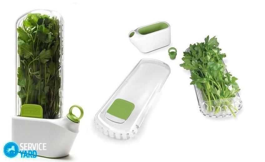 Si no le gusta "hecho en casa", pero prefiere usar electrodomésticos de cocina ya preparados, consiga un recipiente de plástico listo para guardar verduras en el refrigerador. Todo está pensado aquí: respira, mantiene el nivel deseado de humedad y un microclima especial. Los verdes no se arrugan, y también está protegido de bacterias y moho.