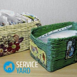 Para hacer hermosa la canasta hecha con materiales improvisados, decore el producto con cinta de encaje, trenza con un patrón, cuentas. Bandejas de papel tonificadas con pintura. Con estos pequeños secretos, puede hacer un artículo práctico y sofisticado que durará más de un año.