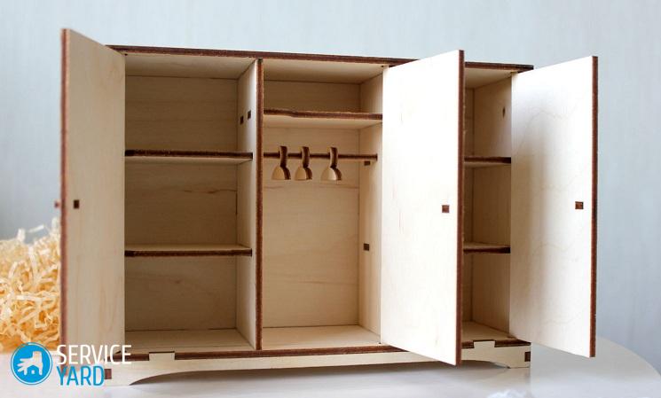 También están hechos de la madera contrachapada más común. Al mismo tiempo, usted mismo puede hacer dibujos y esquemas fácilmente si ya ha intentado hacer un sofá. La única dificultad son las puertas. Pero para ellos puedes comprar bucles en miniatura especiales, y para bolígrafos, por ejemplo, los peones de ajedrez, perdidos en toda la habitación, son adecuados.