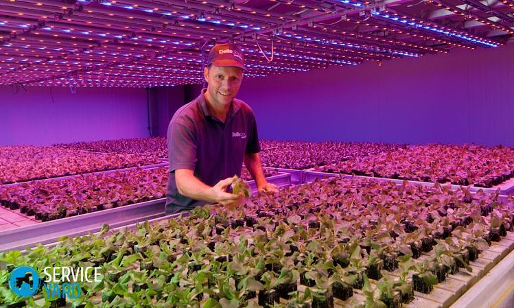 Importante! Es ventajoso usar fuentes fluorescentes en invernaderos e invernaderos cuando se cultivan vegetales para la venta. Una pequeña lámpara cubre grandes áreas, proporcionando a los brotes la luz que necesitan.