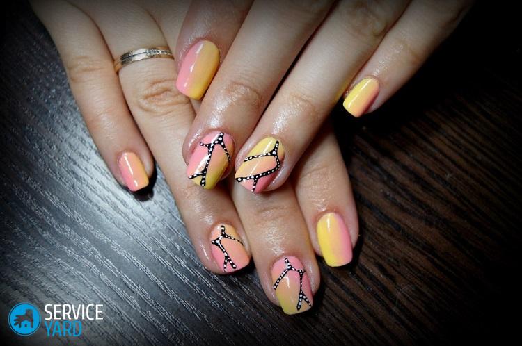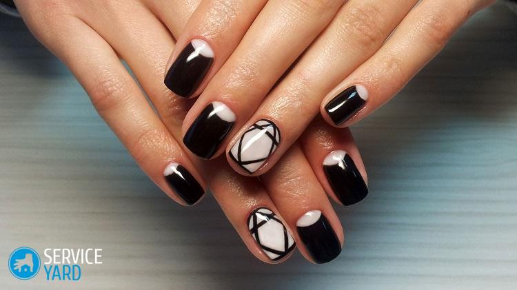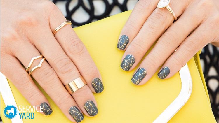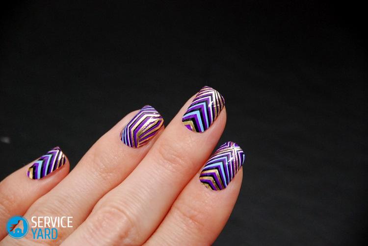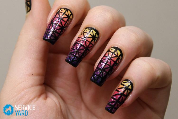 Aplicación de esmalte de gel de secado rápido. El dibujo en la superficie de la uña se aplica con una aguja, esponja o pincel. Con la ayuda de cinta adhesiva o tiras adhesivas especiales, cree dibujos de formas geométricas.
