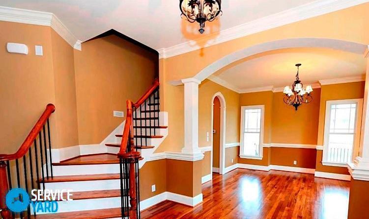 Importante! En el proceso de elegir una pintura, debe tenerse en cuenta que debe ser del mismo color que el techo o un tono más oscuro. Al mismo tiempo, considere el color de las plataformas y la hoja de la puerta para que la habitación se vea armoniosa. Si las paredes están pegadas con papel tapiz con adornos, es mejor elegir zócalos sin ningún dibujo.