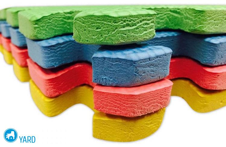 Importante! La mayoría de las veces, los pisos blandos se producen para habitaciones de niños en forma de un cuadrado con tamaños laterales de 25, 30, 33, 50, 60 y 10 cm. Los bordes de cada módulo tienen recortes, como en los rompecabezas, y se usan para sujetar elementos juntos.