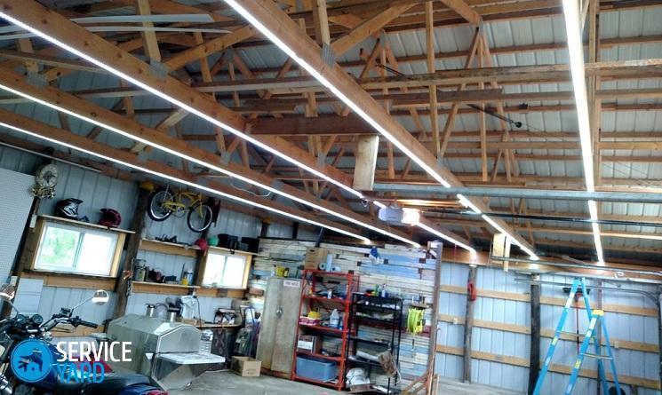 No es suficiente colgar solo una lámpara de techo en el garaje. Es necesario instalar varios puntos de iluminación local que se ubicarán por encima de las superficies de trabajo principales, como una mesa, el compartimento del capó, el perímetro del automóvil, si es necesario, trabajos de pintura.