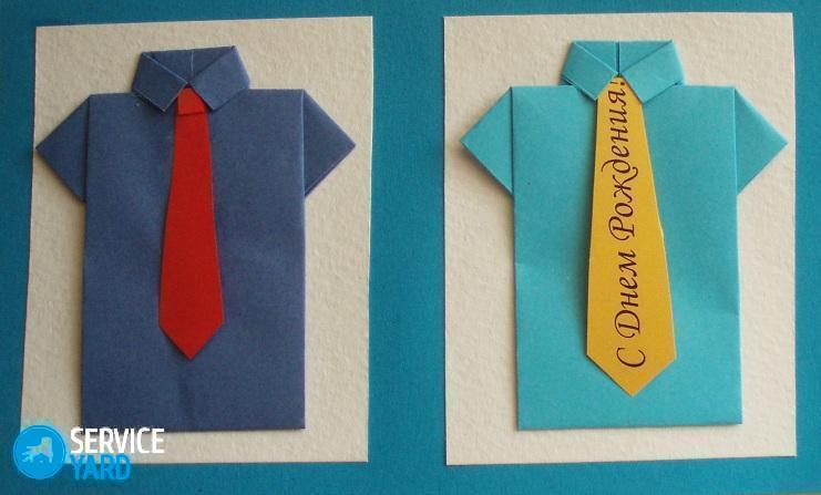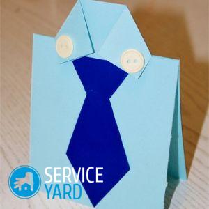Como regla general, las tarjetas se entregan además del obsequio principal, pero presentarlo en una forma terminada con texto estándar es de alguna manera descortés. Una camisa de papel hecha a sí misma con corbata se puede usar no solo como una postal, sino incluso como una invitación original.