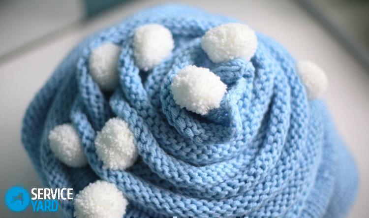 Si no tiene tiempo libre, pero aún desea complacer a sus seres queridos con un regalo tan encantador, puede intentar tejer una manta de pompones con sus propias manos con hilo especial. Es suficiente al menos en el nivel inicial para poseer agujas de tejer. Para hacer una manta cuadrada de 75 por 75 cm, compre 4 madejas de hilos acrílicos con pompones, cada una con un peso de 100 gramos. Los productos hechos de hilo tricolor se ven bastante hermosos.