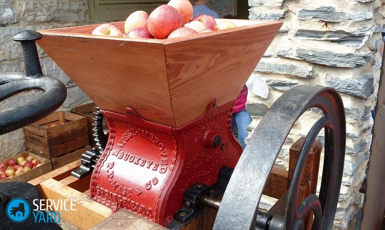 Importante! Todas las prensas de jugo funcionan en conjunto con molinos. El mecanismo más simple es un rallador de tambor de acero, que se coloca en una carcasa que tiene un cuello de carga. Cuando se gira el mango, la picadora funciona, en la cual las frutas se convierten en pulpa de migas muy pequeña.