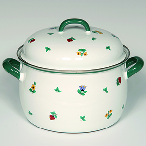 Esta vajilla alemana está hecha en China y es de alta calidad. Particularmente notables son sus ollas de esmalte. Están hechos de metal duradero recubierto con una capa de esmalte de calidad: