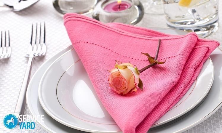 Importante! Para el uso diario, las servilletas de algodón son más apropiadas, ya que no se ensucian demasiado fácilmente y mantienen su forma. La versión de satén y lino se ve más festiva, pero al mismo tiempo, la molestia de lavar y almidonar tales elementos decorativos surge mucho más. Si decide elegir la segunda opción, asegúrese de tener en cuenta varias formas, cómo almidonar servilletas.