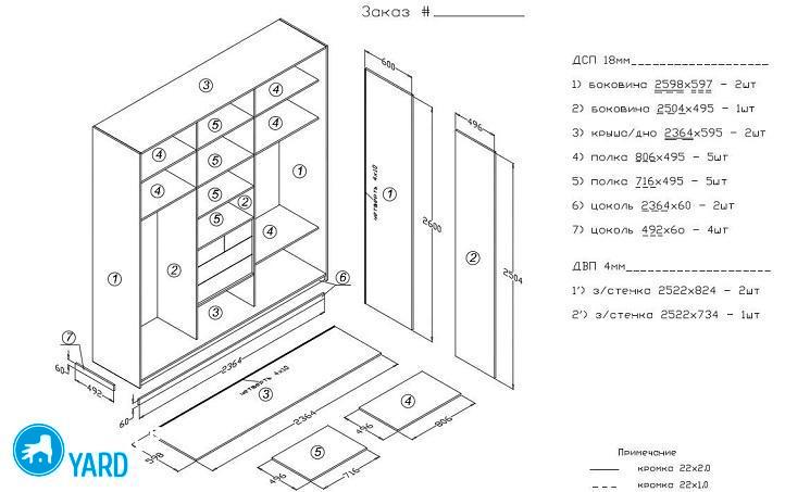 Puede dibujar o hacer un boceto en su computadora de su futuro guardarropa, imprimirlo y mostrárselo al asistente. Por cierto, en el mismo taller puedes hacer dobladillos. Un gabinete bastante simple consta de las siguientes partes: