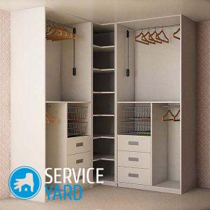 No es fácil elegir accesorios para tal modelo de gabinete debido a su forma inusual, pero, sin embargo, la tarea principal es conseguir cualquier cosa sin dificultad especial. Como regla, las varillas se instalan en la parte central de dicho gabinete para acomodar perchas.