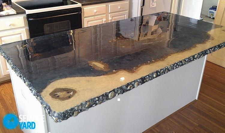 De acuerdo con el mismo esquema, puede hacer productos de vidrio roto con sus propias manos. La encimera en este caso se verá más elegante debido al parpadeo de fragmentos multicolores. La única diferencia es que la primera capa se llena con vidrio, solo entonces se vierte la mezcla de concreto. Como puede ver, no hay trucos especiales aquí. Obtendrá una cosa verdaderamente exclusiva y hermosa para decorar su cocina.