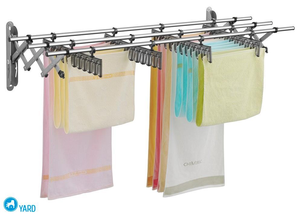 - Barbell La secadora está montada solo en una de las paredes. Las barras transversales caen fácilmente a un nivel conveniente para usted, lo que facilita en gran medida la ropa colgada. Este producto es perfecto para secar cualquier ropa y productos de lana que no se puedan secar cuando se pliegan para evitar la deformación. Un producto de punto hecho de lana se coloca encima de las varillas, lo que permite enderezar el proceso de secado.