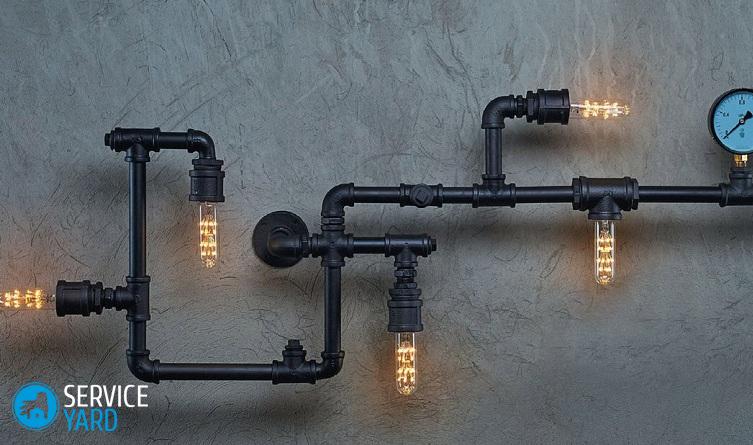 - Se obtienen opciones de pared interesantes a partir de tuberías simples de plomería, donde las lámparas se insertan en las juntas y puentes.