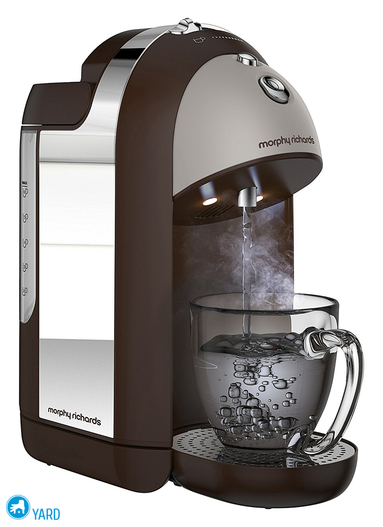 Este modelo multifuncional está hecho de metal plástico y equipado con relleno de microprocesador. Con la pantalla de cristal líquido, puede establecer la temperatura deseada y, posteriormente, ejercer un control similar sobre ella. Además de los elementos principales, el diseño de este dispositivo también incluye un filtro, un nivel de agua, un mecanismo de rotación y un dispensador de agua.