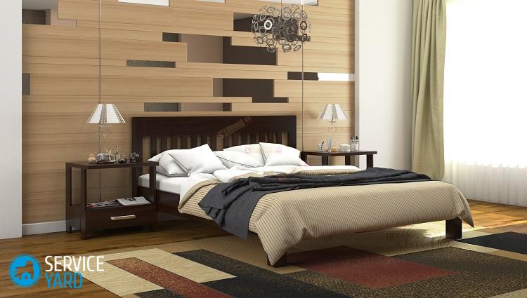 - Los paneles debajo de la raza de nogal se pueden decorar con toda la pared a la que se une la cama.En este caso, los estantes de luz con varios elementos decorativos serán apropiados en él.
