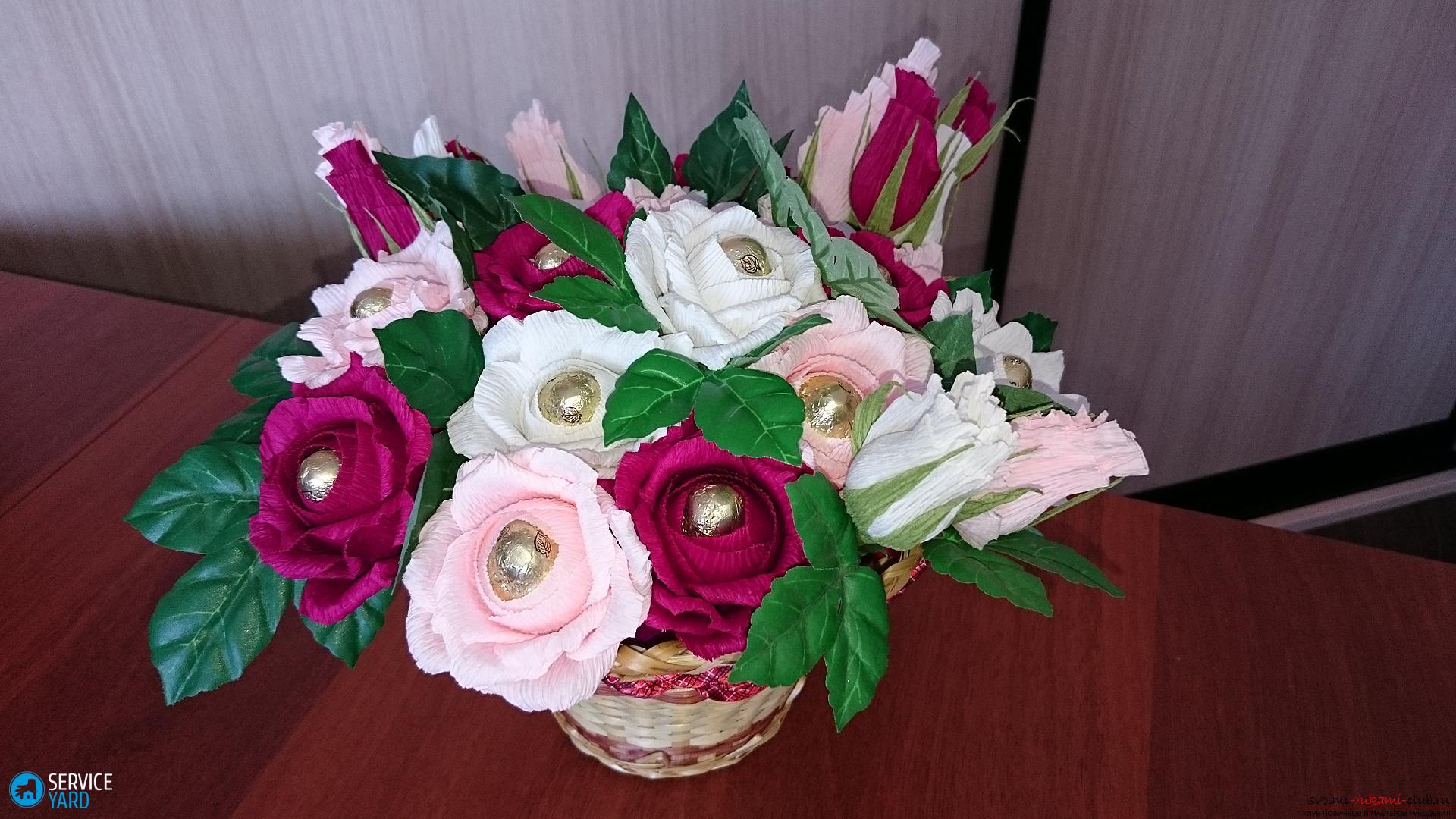 Las flores de bricolaje de servilletas con dulces son fáciles e interesantes. Por lo tanto, puede hacer un regalo original único para una persona querida e invertir una parte de usted en él. Por lo tanto, tal regalo será especialmente valioso. No tengas miedo de experimentar. Comience con los colores más simples, si le gusta este pasatiempo, pronto obtendrá composiciones más complejas. Siga las instrucciones en el artículo y comience a crear ahora mismo.