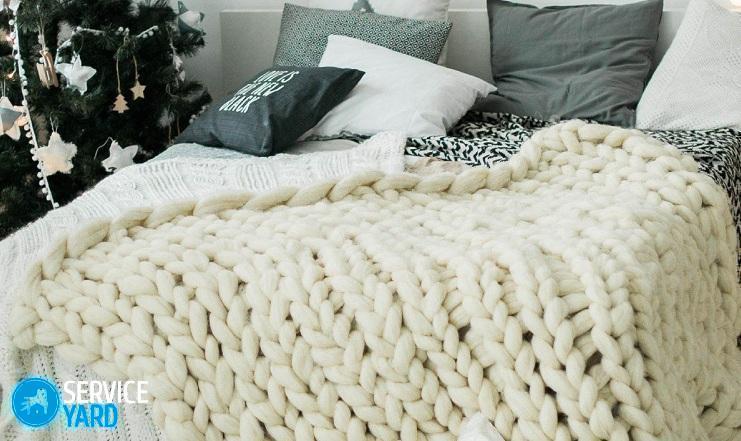 Una idea muy interesante es crear una manta gigante de bricolaje, puede usarse como una manta o una manta. Además, al elegir materiales hipoalergénicos, puede tejer una colcha en una cuna.