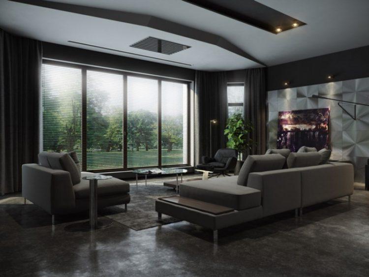 El color negro se ve genial como dominante en el diseño de salas de estar. Vea cómo el diseño negro de la sala del apartamento (foto a continuación) se combina con muebles y cortinas más claros con un patrón dorado. El interior negro de la sala del apartamento (foto en la compilación) se ve elegante y solemne.
