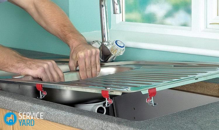 - Puede arreglar el lavado de la superficie con un método deslizante. En este caso, el gabinete debe estar equipado con guías y el fregadero debe tener bordes curvos especiales. La instalación de dicho modelo es bastante simple: inserte los elementos suficientemente curvados del fregadero en los gabinetes de guía y empújelo completamente.