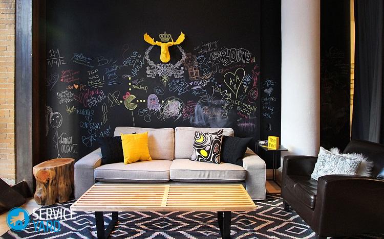 En pocas palabras, el papel pintado de pizarra es una película autoadhesiva. Para pegarlos en la pared, es suficiente quitar la capa de papel protector del lado equivocado. La tecnología para unir esta película es extremadamente simple. La parte frontal de los lienzos de tiza está representada por la pulverización de vinilo, que ayuda a formar una superficie para dibujar con tiza. Se lava bien con un paño húmedo.